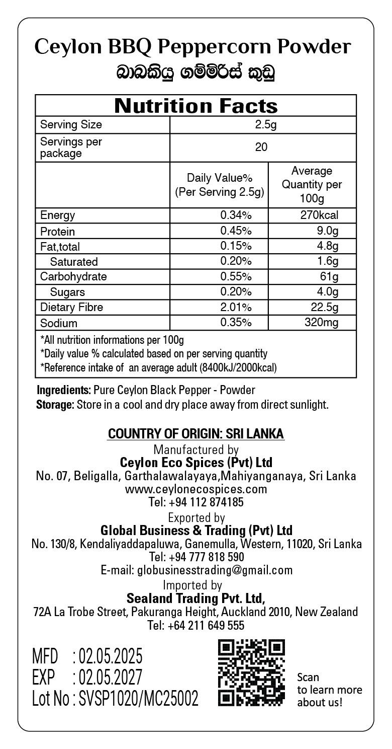 Elevate your grilling game with Ceylon BBQ Pepper Powder—a bold, aromatic spice blend crafted from 100% pure dried peppers. Perfect for rubs, marinades, or seasoning meats, this powder adds a smoky depth and a hint of heat to BBQ dishes, steaks, and roasted veggies.